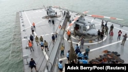 Индонезийские спасатели продолжают поиски "черных ящиков", что необходимо для выяснения причин авиакатастрофы. Ранее сообщалось, что недалеко от участка, где был найден хвост лайнера, были зафиксированы сигналы, которые, предположительно, могут подавать бортовые самописцы.