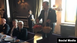 "Лавров подарил Керри краснодарские помидоры и картошку, находящуюся в дальних родственных связях с той, которую в свое время ему привез американский коллега. А еще Дж. Керри увезет в Вашингтон футболку с символикой Победы", — написала Захарова, сопроводив публикацию фотографиями процесса вручения подарков.