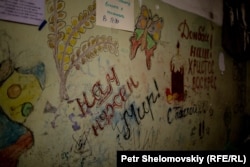 А пока звуки падающих снарядов еще доносятся с улицы, дети разрисовывают стены своего временного жилища надписями, призывающими к миру.