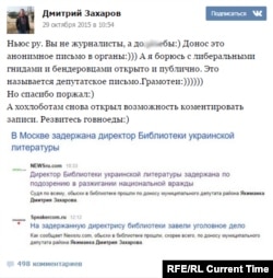 Столичный депутат Дмитрий Захаров — автор заявления, после которого в библиотеке начались обыски. Правда, на своей страничке "Вконтакте" он просит называть это не доносом, а депутатским письмом.