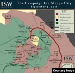 На карте Institute for the Study of War показано, какие силы контролируют районы в Алеппо. На ней также показана линия обеспечения, которую пытаются прорвать оппозиция и правительственная армия.