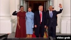 Барак и Мишель Обама встретили Дональда и Меланию Трамп в Белом доме незадолго до отправки к Капитолию на церемонию инаугурации.