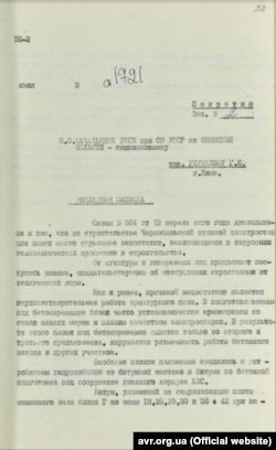 Начальник управления КГБ при Совете министров УССР в Киевской области Фесенко написал докладную записку первому секретарю Киевского областного комитета КП Украины Цыбулько В.М. В ней он отметил, что во время строительства Чернобыльской АЭС обнаружено "нарушение технических норм". В частности, недостаточно плотной была закладка бетона на блоке "Г", а в главном корпусе были различия между арматурой, чего не внесли в проектную документацию.