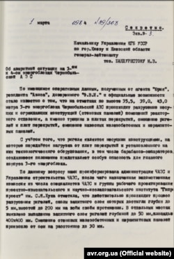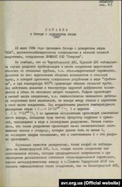 Начальник 6-го отдела УКГБ УССР в Киеве и Киевской области полковник Турко М.А. сообщил начальнику Припятского ГО УКГБ УССР в Киеве и Киевской области подполковнику Николаеву Ю.В. о получении информации о "недостаточной надежности реакторов РБМК-1000", которые применяются на ЧАЭС. "По мнению специалистов, в случае разрыва главного циркуляционного трубопровода в результате естественного старения металла, при отсутствии системы аварийного слива активной зоны и защитной оболочки вокруг реактора, произойдет утечка теплоносителя и, как следствие, значительное радиоактивное заражение местности. Причиной серьезной аварии может стать остановки подачи электроэнергии на системы управления работы реактора", – отмечает Турко.
