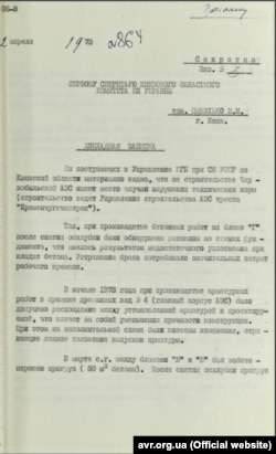 Документ: "Докладная записка о нарушениях при строительстве ЧАЭС", 1973 год, (стр.1)
