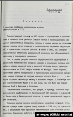 Документ: "Справка о разговоре с доверенным лицом "ЖВА" о неисправности на ЧАЭС", 1984 год (стр.1)