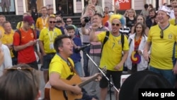 Уличному музыканту на время пришлось отдать свою гитару шведскому фанату, который устроил мини-концерт.