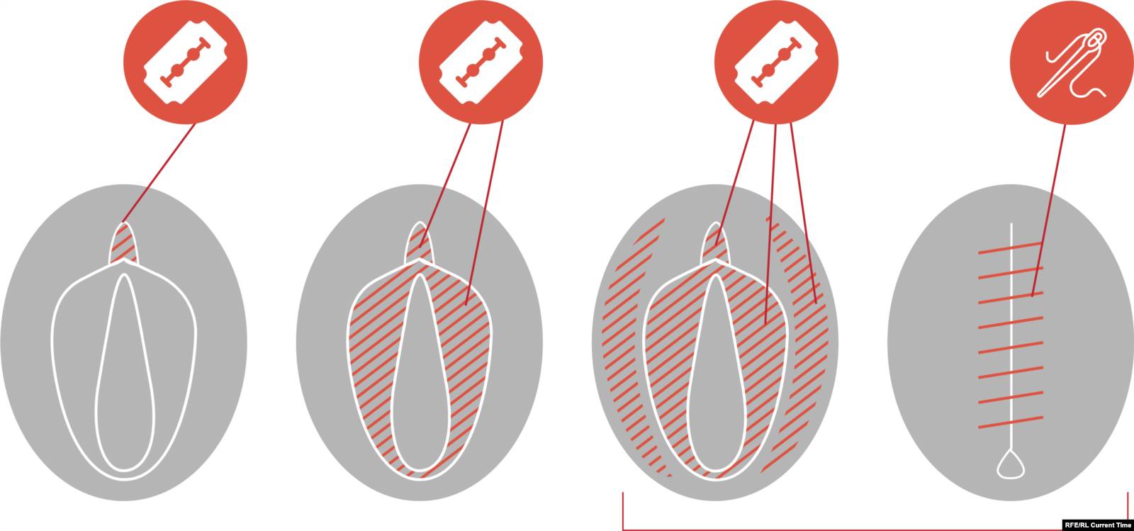 "Термин "калечащие операции" включает несколько процедур. Это клитородектомия – частичное или полное удаление клитора; эксцизия – частичное или полное удаление клитора и малых половых губ, а порой и больших. Еще есть инфибуляция – когда в результате обрезания половых губ создается твердое кольцо, сужающее вход во влагалище. Причем, как правило, эти манипуляции проводятся в домашних условиях, без анестезии, с помощью простого ножа", – отмечают в ООН.