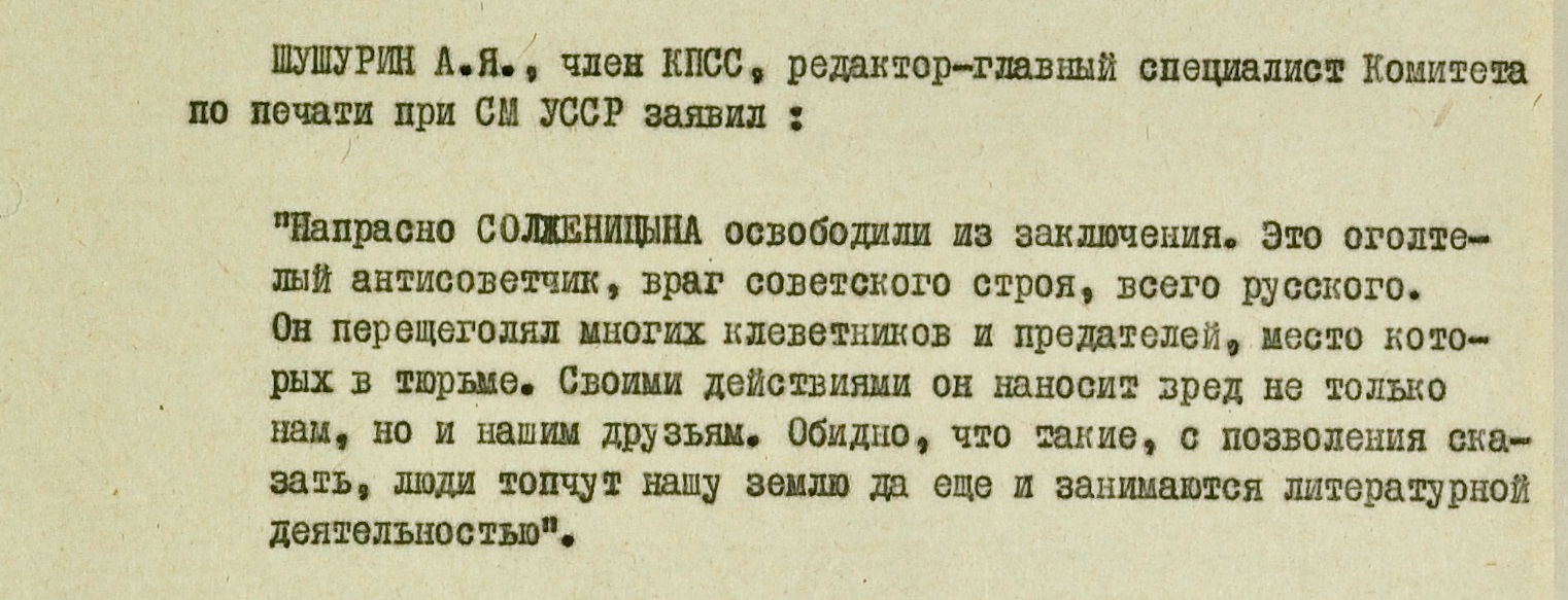 “КГБ при СМ УССР принимает меры для использования отрицательного отношения украинской эмиграции к Солженицыну в интересах нашего государства”, – сообщалось в одной из записок. К кампании против писателя чекисты подключили “прогрессивные” (лояльные к СССР) структуры американских украинцев. В ряде газет диаспоры вышли статьи “о единодушном осуждении советской общественностью антинародной деятельности Солженицына”.