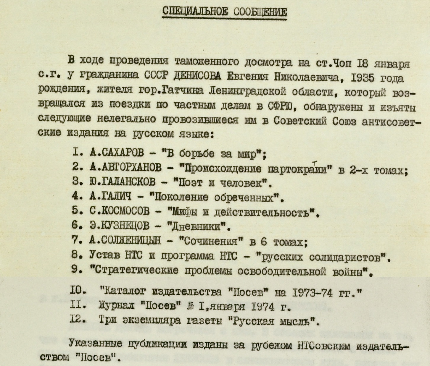 Случались и попытки ввезти в страну “тамиздатовские” (выпущенные на Западе) экземпляры книг Солженицына. В 1974 году на станции Чоп (граница УССР с Венгрией и Чехословакией) таможенники изъяли у жителя Гатчины Евгения Денисова более десяти запрещенных изданий. Среди них – шеститомное собрание сочинений Солженицына. Денисов возвращался из Югославии.