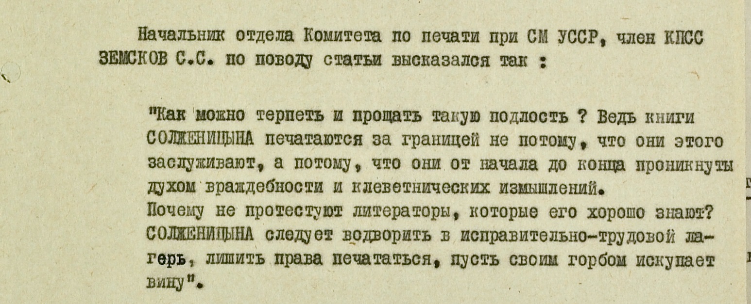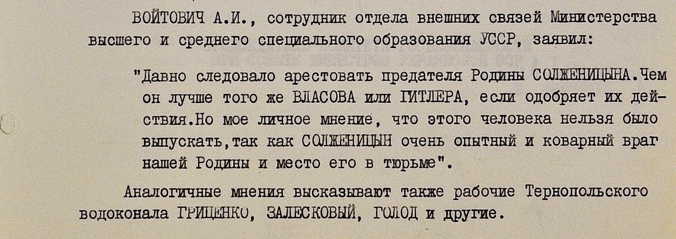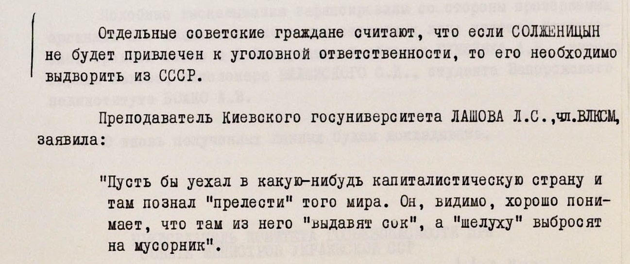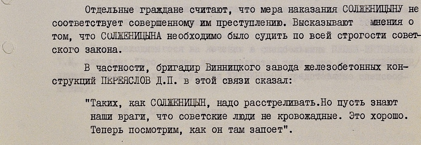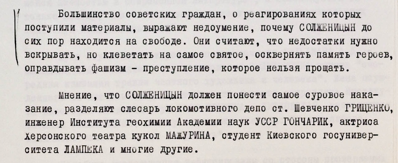Тональность большинства зафиксированных высказываний населения – та же, что и раньше. Слесарь локомотивного депо Гриценко, инженер Института геохимии Академии наук УССР Гончарик, актриса Херсонского театра кукол Мажурина, студент Киевского госуниверситета и многие другие оказались солидарны в своих требованиях назначить “самое суровое наказание” Солженицыну.