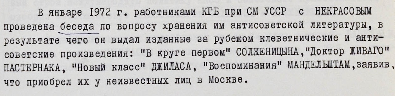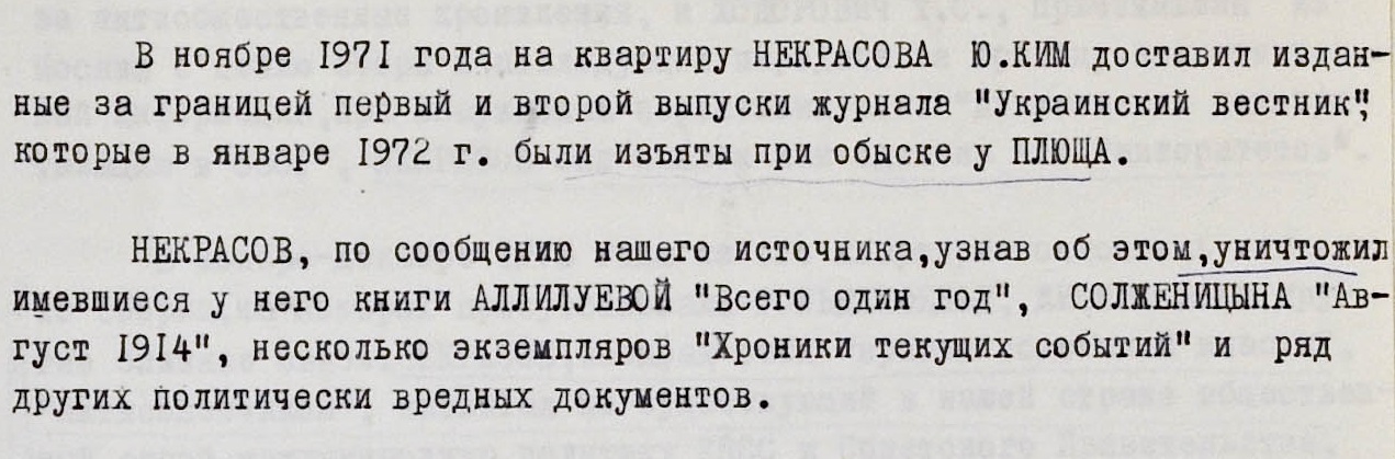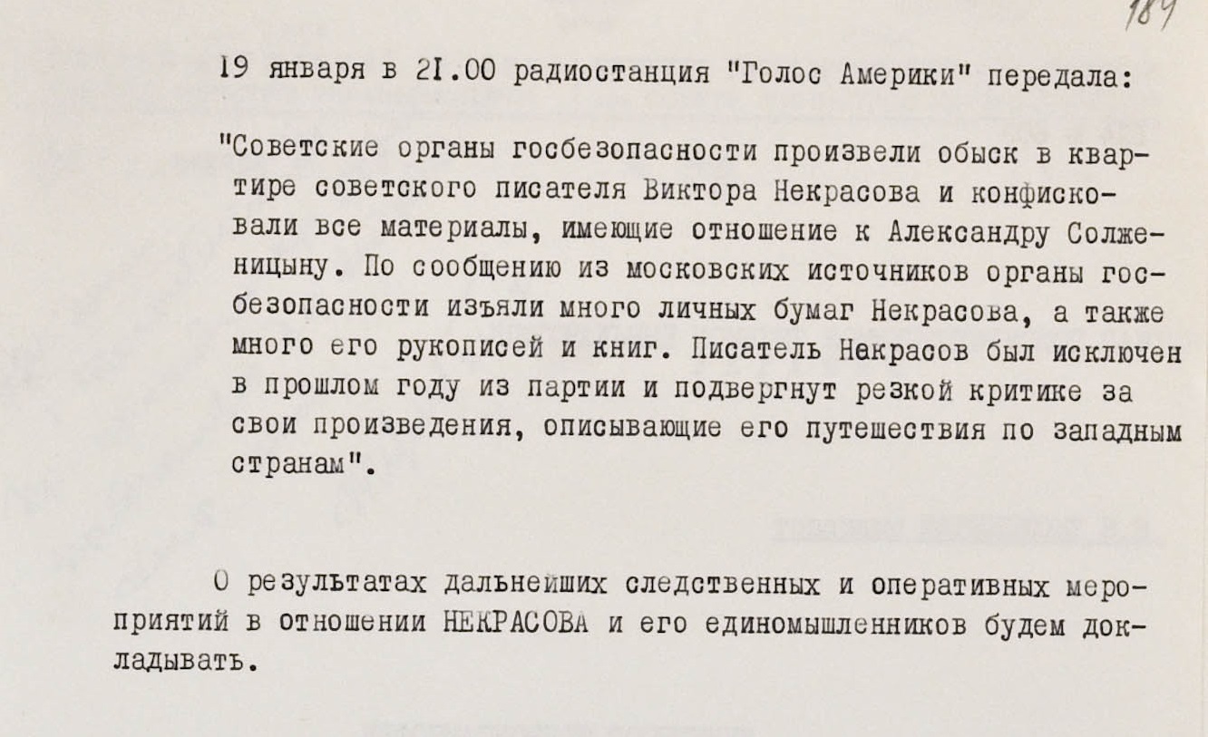 Среди известных жителей УССР, которых подозревали в симпатиях к Солженицыну и хранении его работ, был писатель Виктор Некрасов.