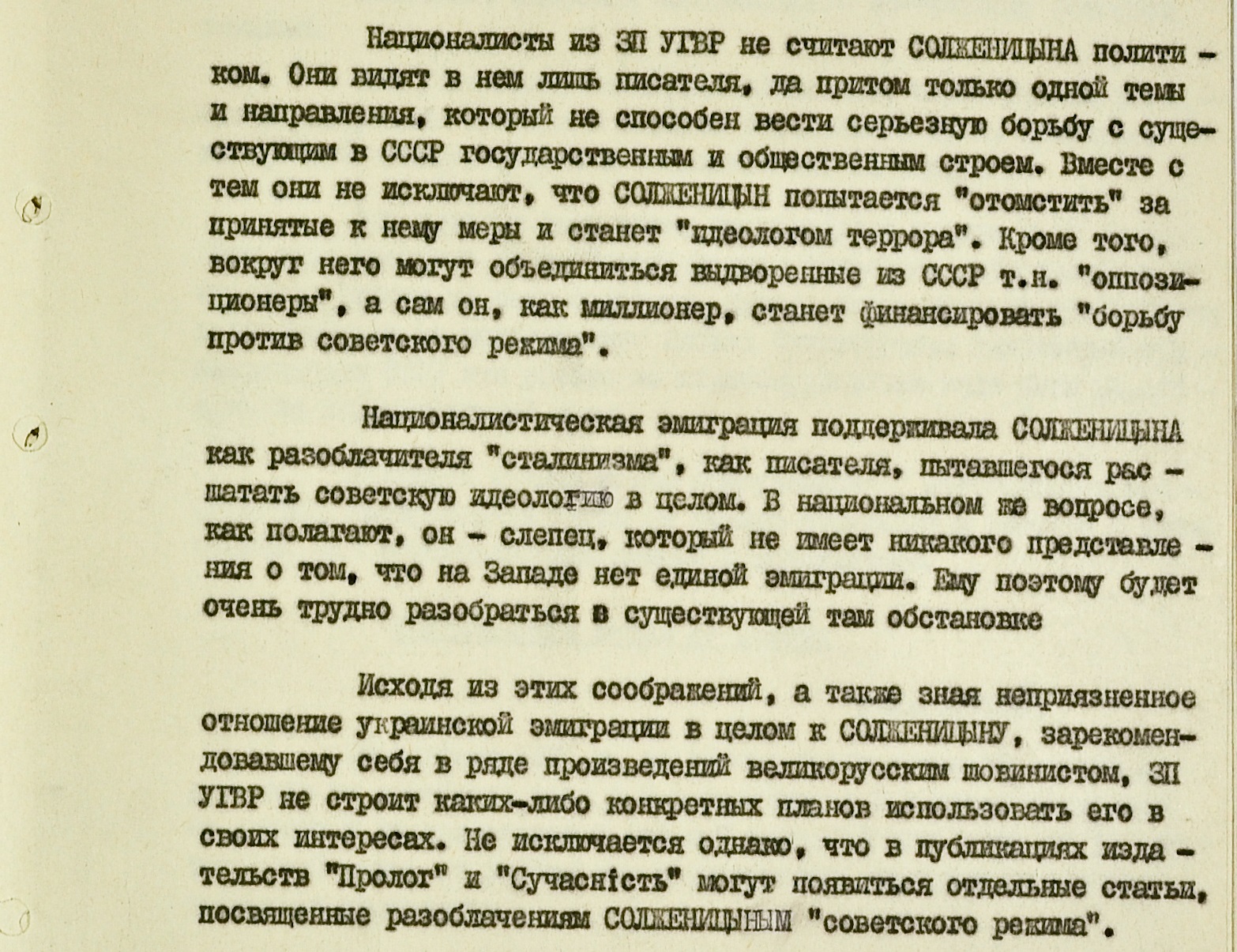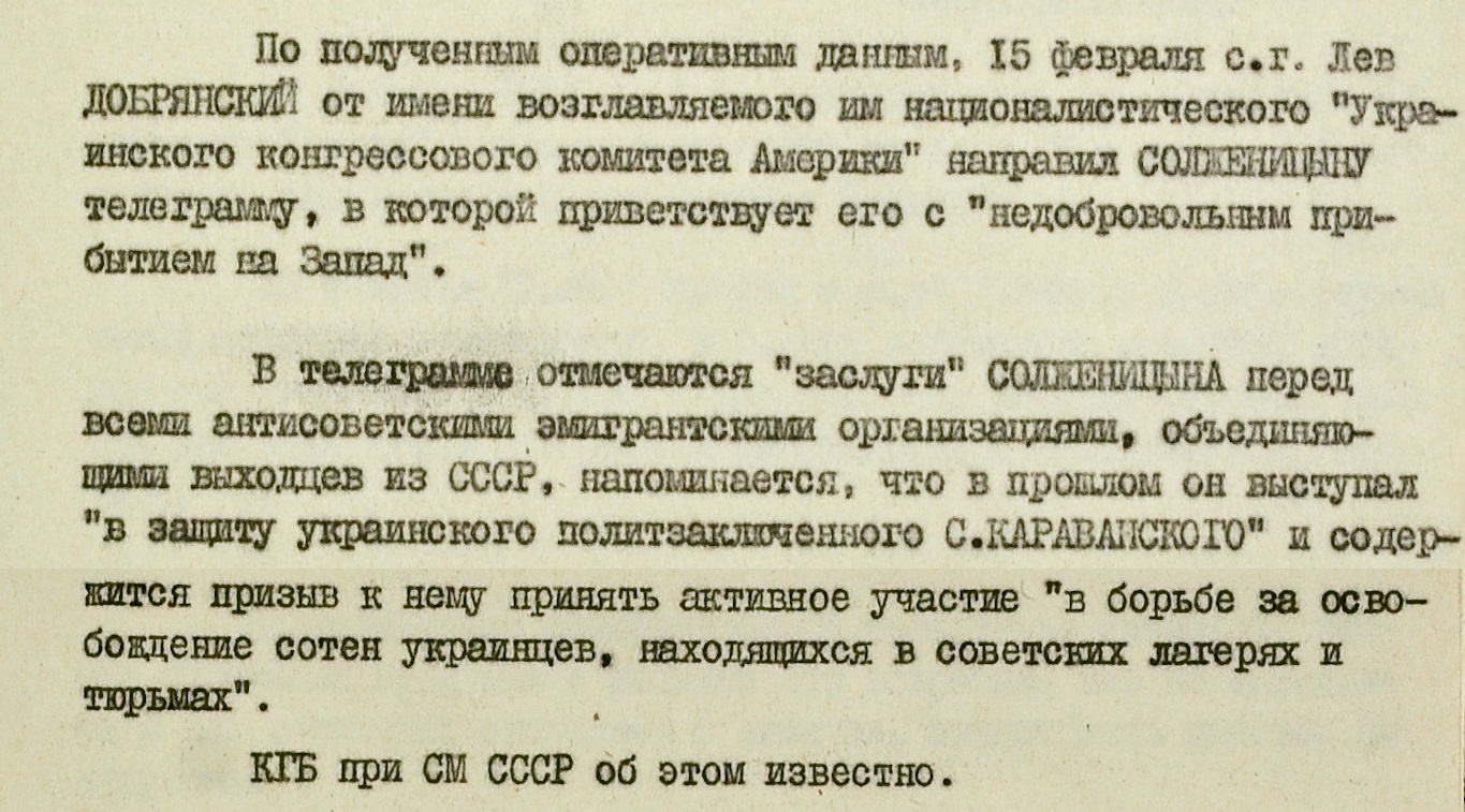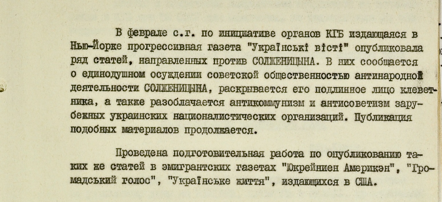 Кроме того, КГБ инициировал выход в нью-йоркском “прогрессивном” издании “Українські вісті” материала “с использованием широко распространенного среди украинских эмигрантов мнения о Солженицыне как о великорусском шовинисте”.