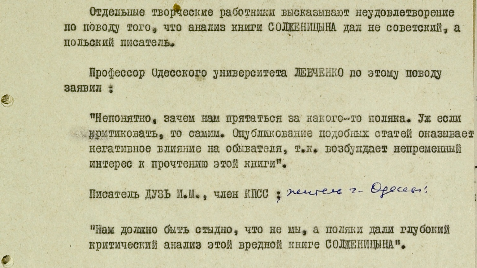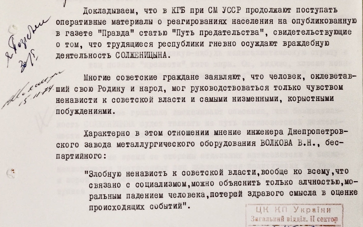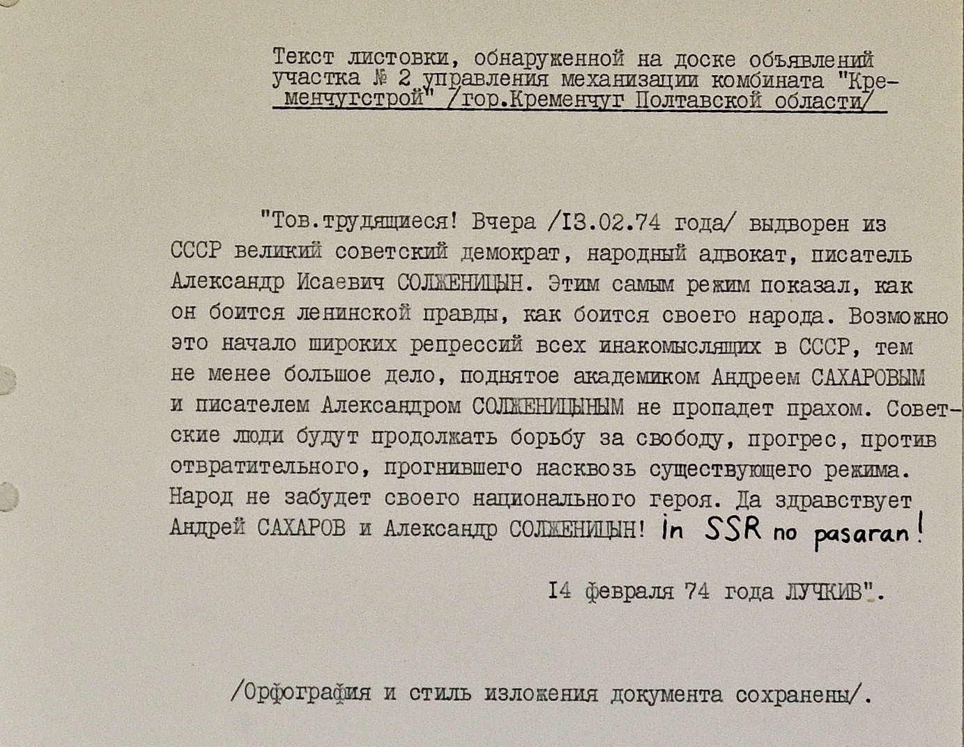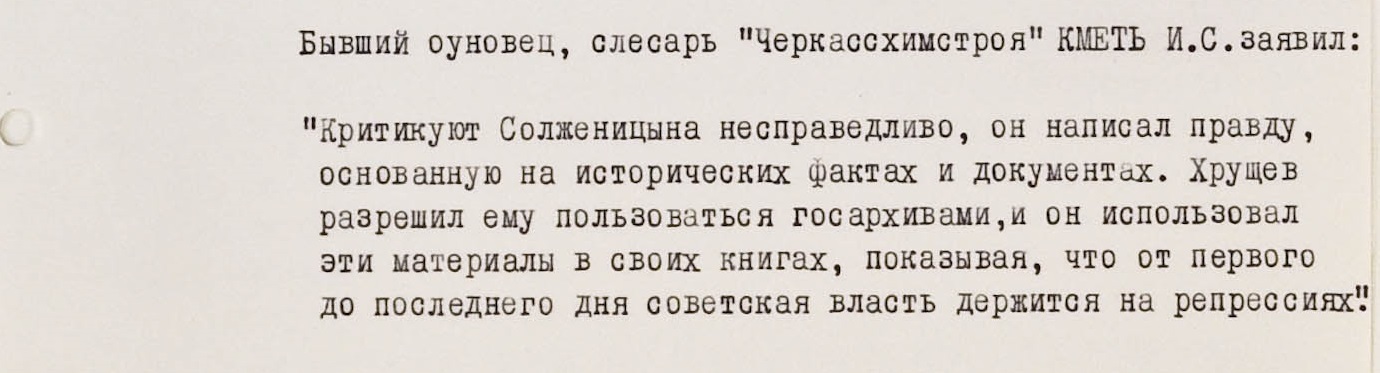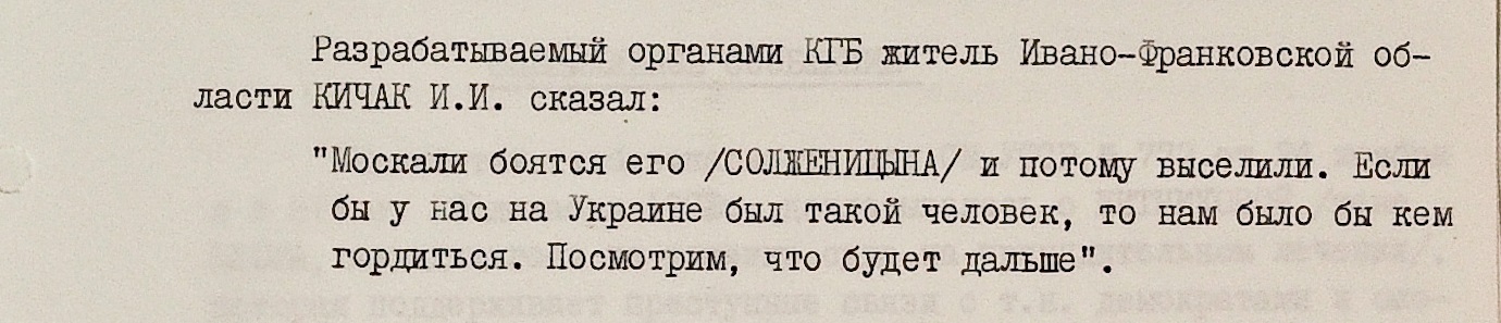 “Кухонными” разговорами поддержка Солженицына не ограничивалась. После его выдворения в некоторых украинских городах обнаружились самодельные листовки в защиту писателя. Некоторые из них попадали в КГБ и тоже сохранились в архиве. В листовке, которую кто-то повесил на доску объявлений комбината в Кременчуге, Солженицына называют “великим советским демократом” и “народным адвокатом”. Автор заявляет, что несмотря на репрессии, люди будут продолжать дело Солженицына и Сахарова – “борьбу за свободу, прогресс, против отвратительного, прогнившего насквозь существующего режима”.