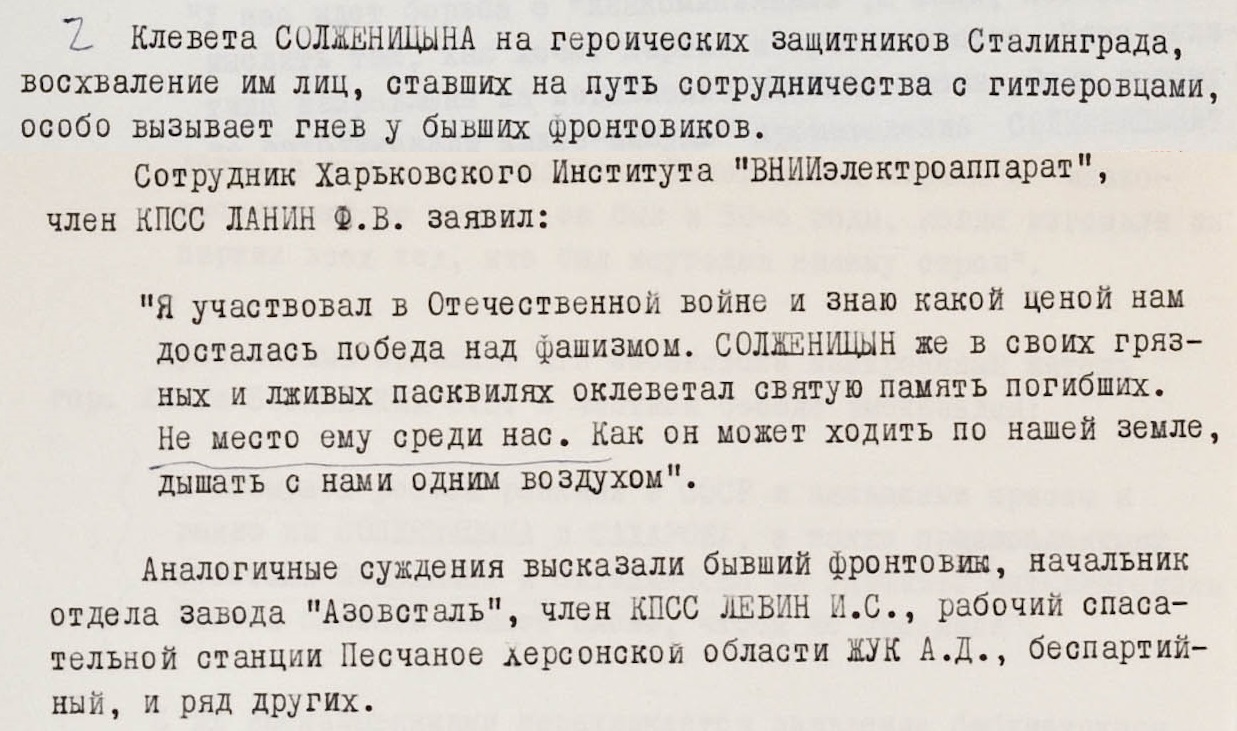 Отдельная тема – “клевета Солженицына на героических защитников Сталинграда, восхваление им лиц, ставших на путь сотрудничества с гитлеровцами”. В документах приводится несколько отзывов возмущенных фронтовиков.