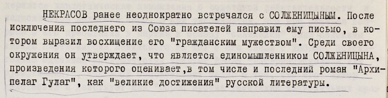 В справке КГБ, посвященной личности Некрасова, отмечается, что он неоднократно встречался с Солженицыным и восхищался его гражданским мужеством.