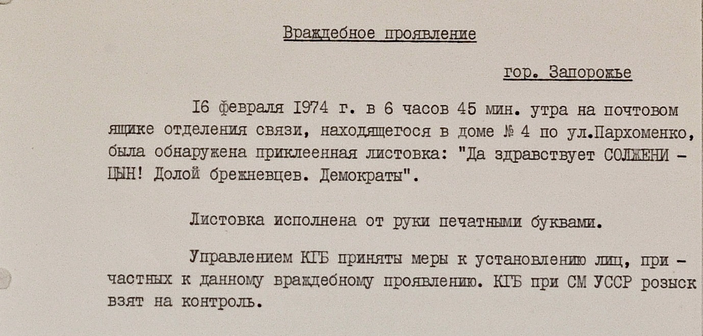 В почтовый ящик запорожского отделения связи бросили листовку с лаконичным текстом: “Да здравствует Солженицын! Долой брежневцев. Демократы”.