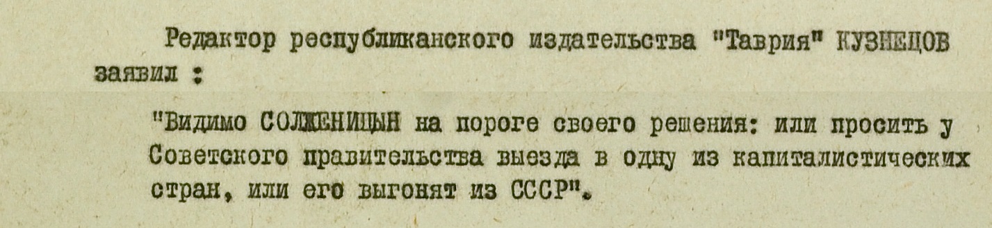 А вот редактор издательства “Таврия” Кузнецов в какой-то мере предугадал судьбу писателя. По его словам, Солженицын должен решить: просить у правительства выезда на Запад или быть изгнанным из страны.