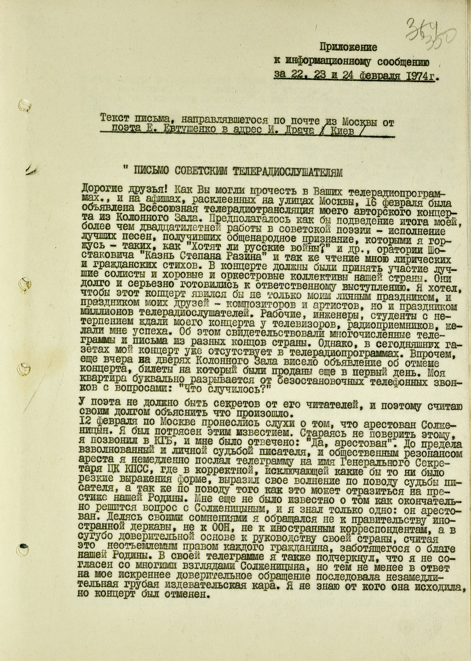Вскоре после высылки Солженицына КГБ перехватил письмо из Москвы, адресованное в Киев поэту Ивану Драчу (который ранее попадал в поле зрения органов из-за антисоветских высказываний и связей с диссидентами). Автором письма был Евгений Евтушенко. Он обращался к советским радиослушателям (Драч, судя по всему, был не единственным адресатом). Евтушенко объясняет недавнюю отмену своего концерта новостью об аресте Солженицына. Он вступается за опального писателя, а также за коллег, поступивших так же и успевших из-за этого впасть в немилость.