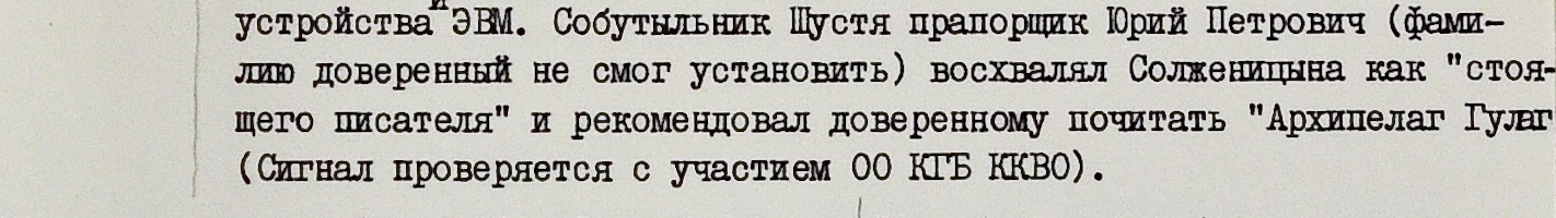 После выдворения Солженицына количество упоминаний писателя в материалах КГБ постепенно падает. Однако все же о нем, как об одном из самых заметных оппонентов режима, не забывали вплоть до самой перестройки. Фамилию живущего в США диссидента и названия его книг можно встретить даже в таких документах, как составленная в 1979 году записка Комитета госбезопасности о “нездоровой обстановке” в киевских ресторанах. До ушей доверенного лица чекистов дошли слова сидящего за столиком подвыпившего военного, который хвалил Солженицына и советовал почитать “Архипелаг ГУЛАГ”.
