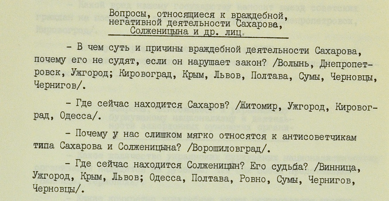 Иногда КГБ отправлял “наверх” списки вопросов, которые наиболее часто задавали его сотрудникам слушатели лекций “о повышении политической бдительности советских людей”. Среди них неизменно встречаются вопросы о Солженицыне. Например, в 1982 году судьбой выдворенного писателя интересовались в десяти городах и областях УССР.
