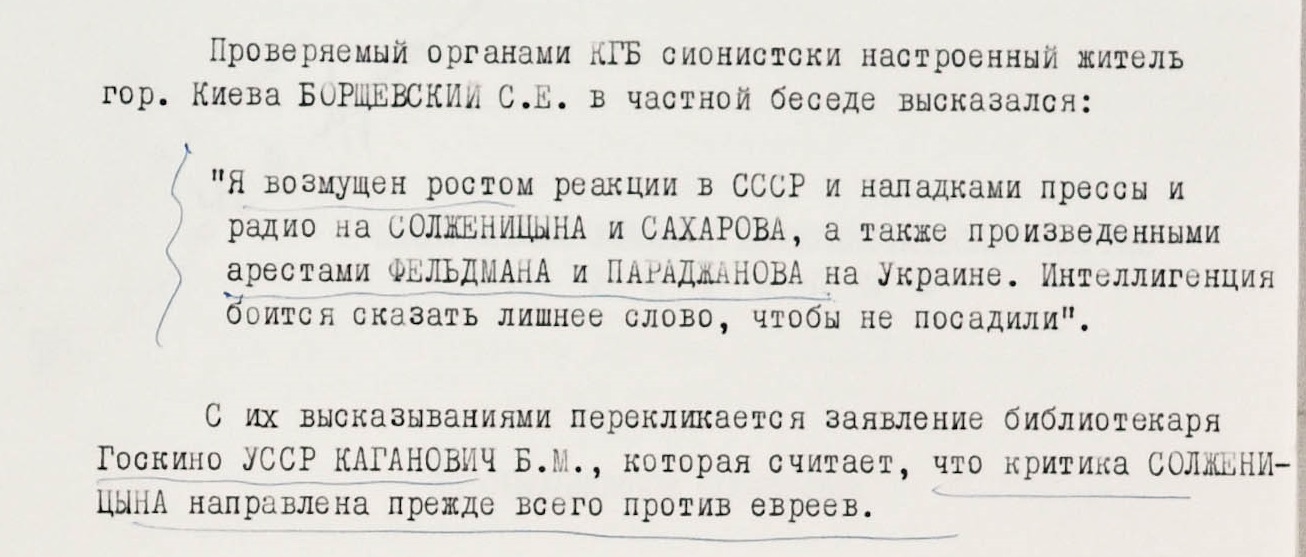 В те годы Мешко, уже будучи пожилой женщиной, неоднократно подвергалась обыскам и допросам, а в 1980-м во второй раз была приговорена к лишению свободы. Беспокойство вызывали и суждения “сионистски настроенных” евреев, которые, как и украинские националисты, постоянно находились “под колпаком”. Киевлянин С. Борщевский в частной беседе выступал против травли Солженицына и Андрея Сахарова, а также арестов режиссера Сергея Параджанова и активиста сионистского движения Александра Фельдмана. Библиотекарь Госкино УССР Б. Каганович высказал довольно оригинальное предположение, что “критика Солженицына направлена прежде всего против евреев” (напомним, впоследствии самого писателя неоднократно обвиняли в антисемитизме).