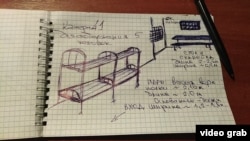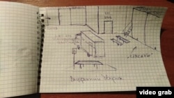 "Ворота если открываются, то первое, что вы видите, – это площадка, две скамеечки, стол. Это место для курения сотрудников. Задержанных туда не выпускают на прогулку", – показывает Сергей рисунки.
