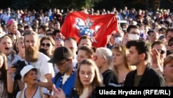 Люди ждали Светлану Тихановскую. Неожиданно официальное мероприятие, проходившее в сквере, было прервано песней Виктора Цоя "Перемен". Ее включили звукорежиссеры официального мероприятия. Они успели рассказать, что работают во Дворце молодежи и уже, скорее всего, эту работу потеряли.