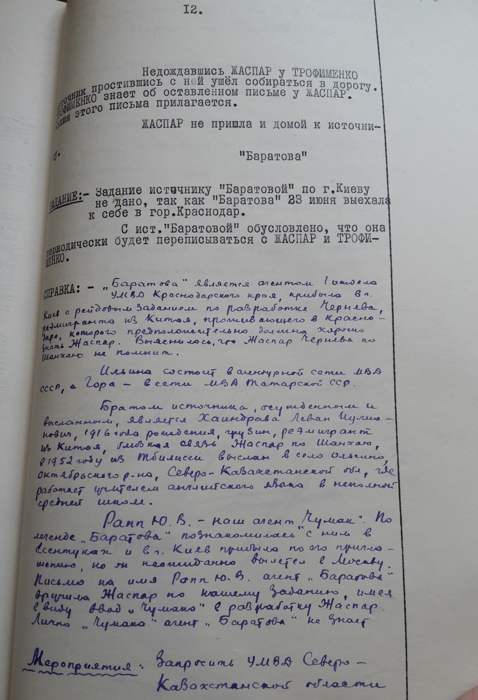 В июне 1952 года киевские чекисты составили и отправили на согласование министру госбезопасности Николаю Ковальчуку план разработки Жаспар из 25 пунктов.