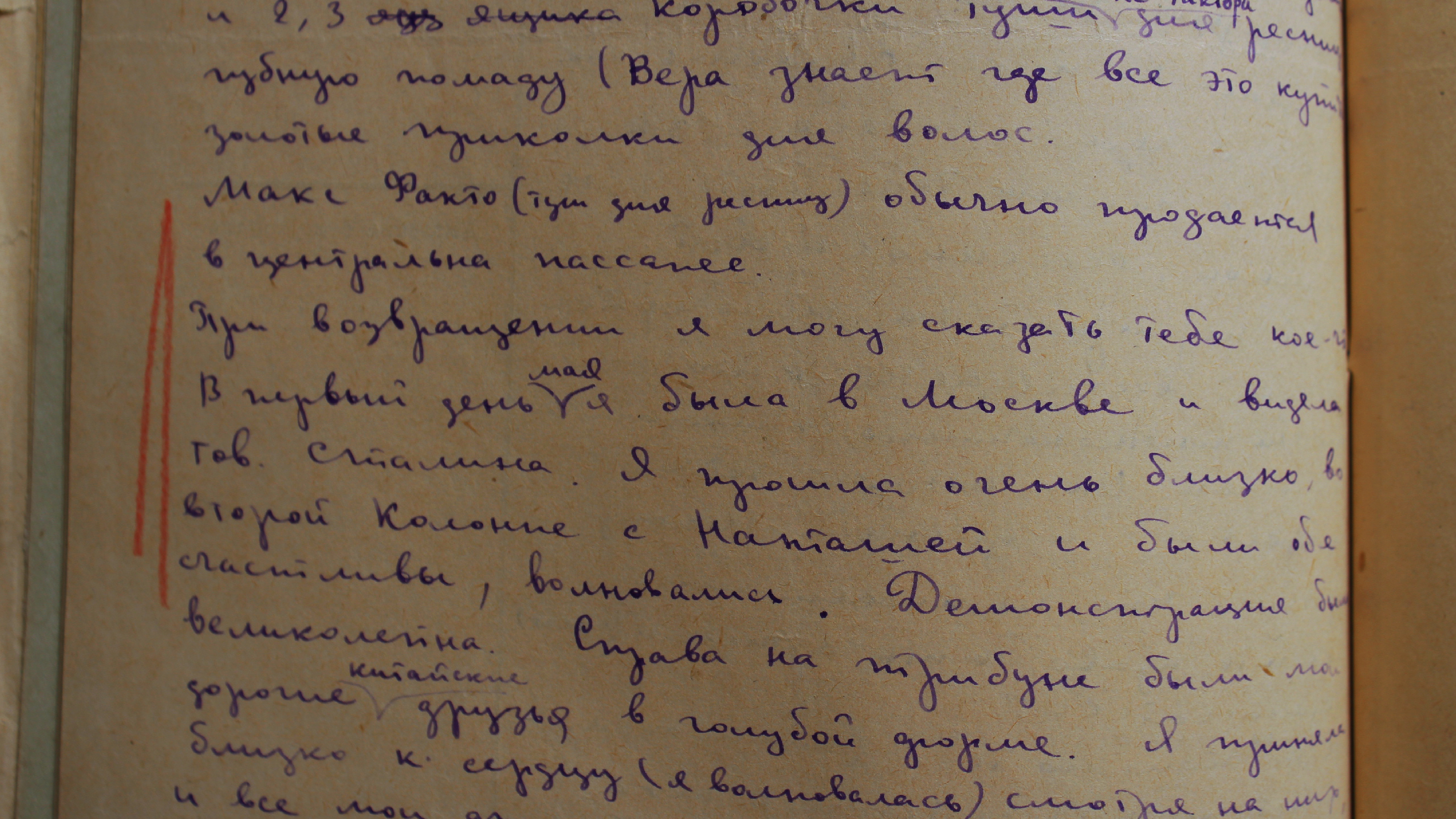 Впечатления Жаспар от первомайской демонстрации, на которой она увидела Сталина. Фрагмент письма бывшему шанхайскому любовнику Моисею Коссовскому, 1952 г.