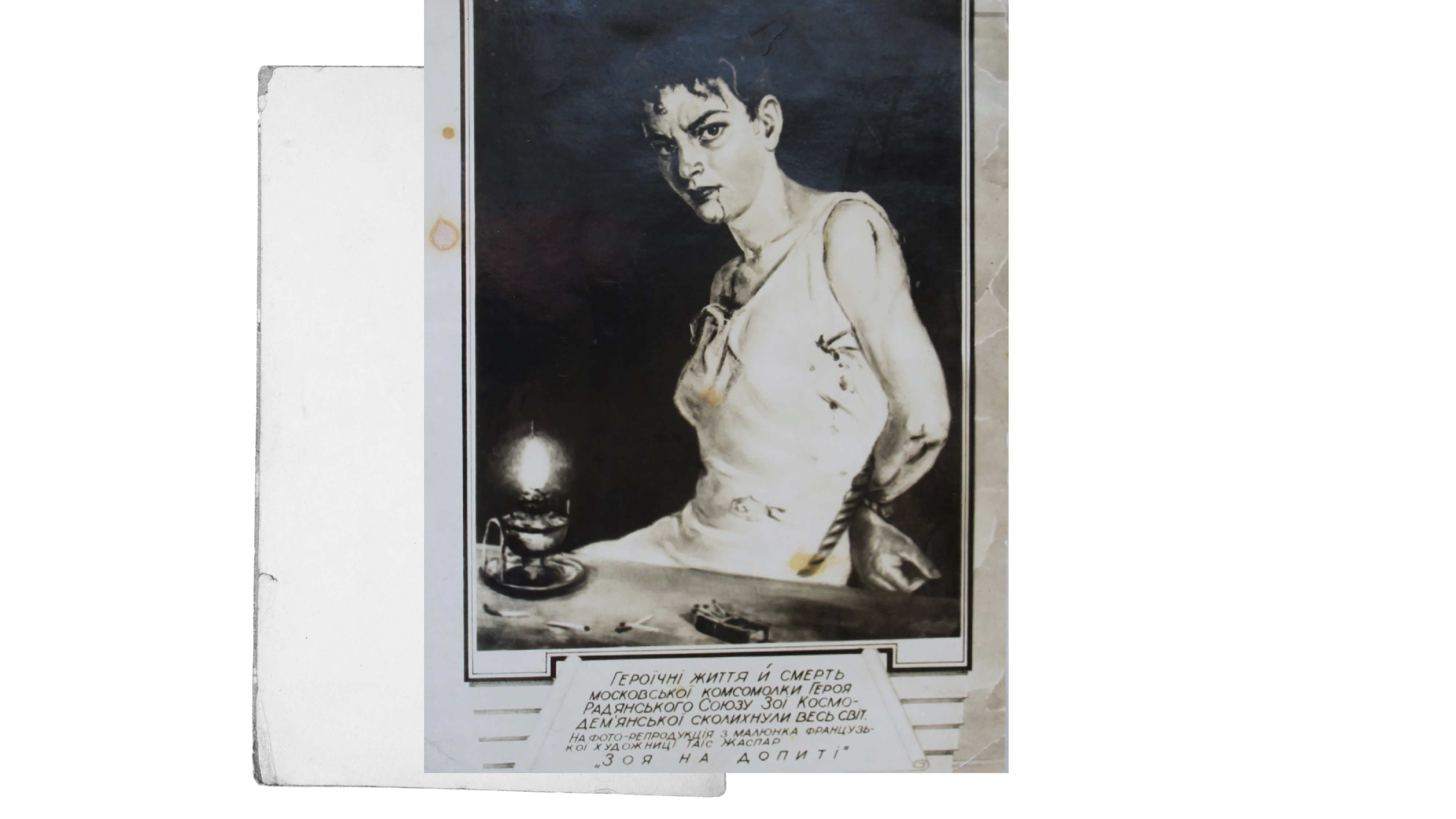 Тот самый таран Таисии — «Зоя на допросе» (фоторепродукция). Центральный государственный архив-музей литературы и искусства Украины (ЦГАМЛИ)