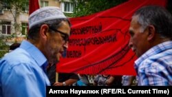 Акция памяти прошла и в Симферополе – у памятного камня возле железнодорожного вокзала, откуда в 1944 году отправляли вагоны с людьми. На нее пришли около сотни человек, в основном пожилые люди. Они принесли с собой флаги.