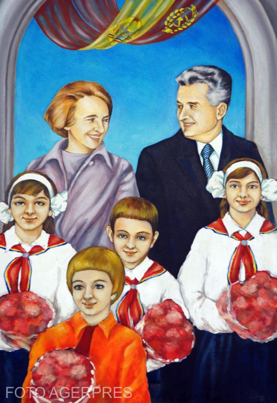 Пропагандистский плакат, изображающий Николае и Елену Чаушеску в окружении пионеров. Экспонат Национального музея истории Румынии