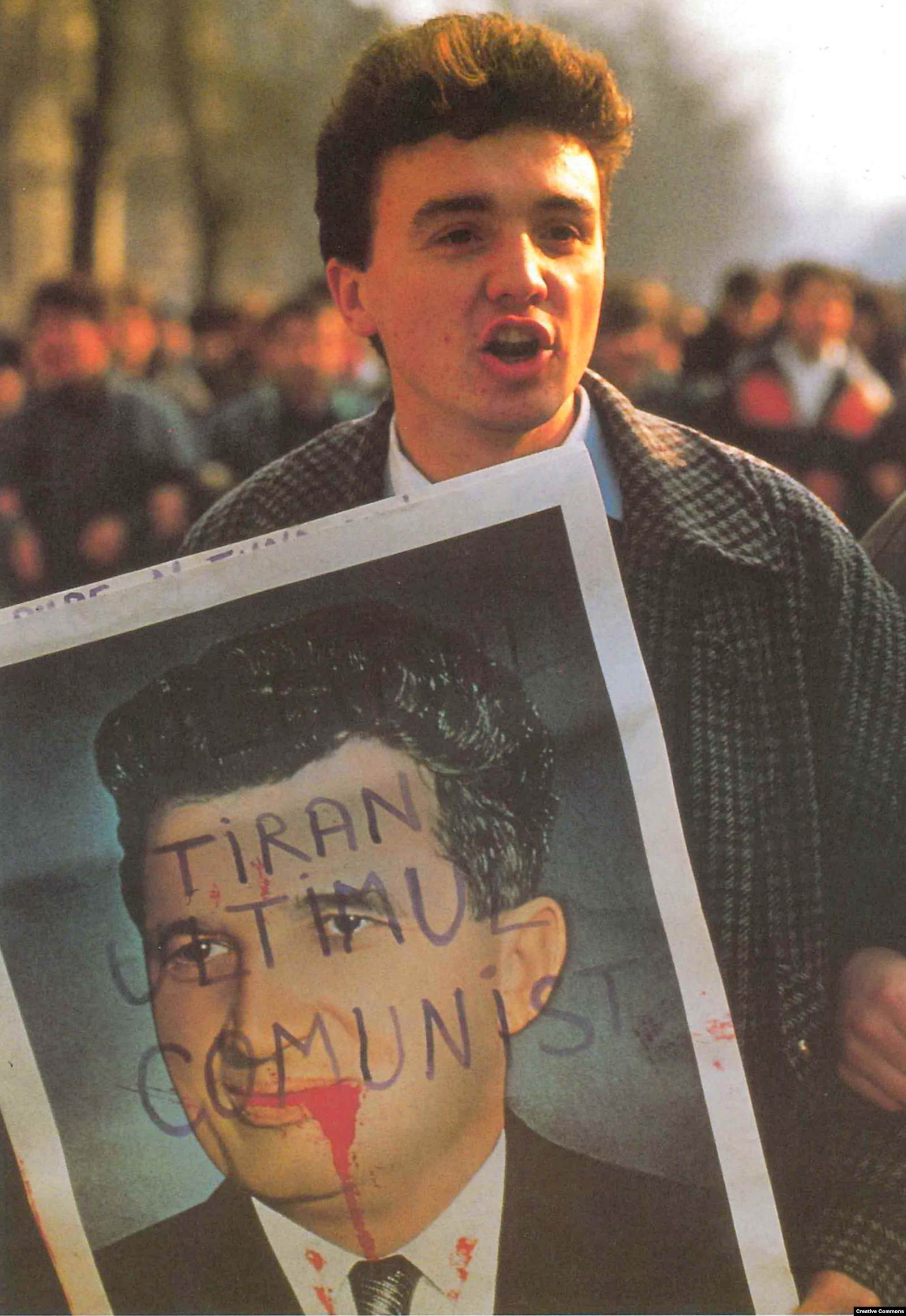 Молодой протестующий с портретом свергнутого диктатора Николае Чаушеску. Бухарест, декабрь 1989 года