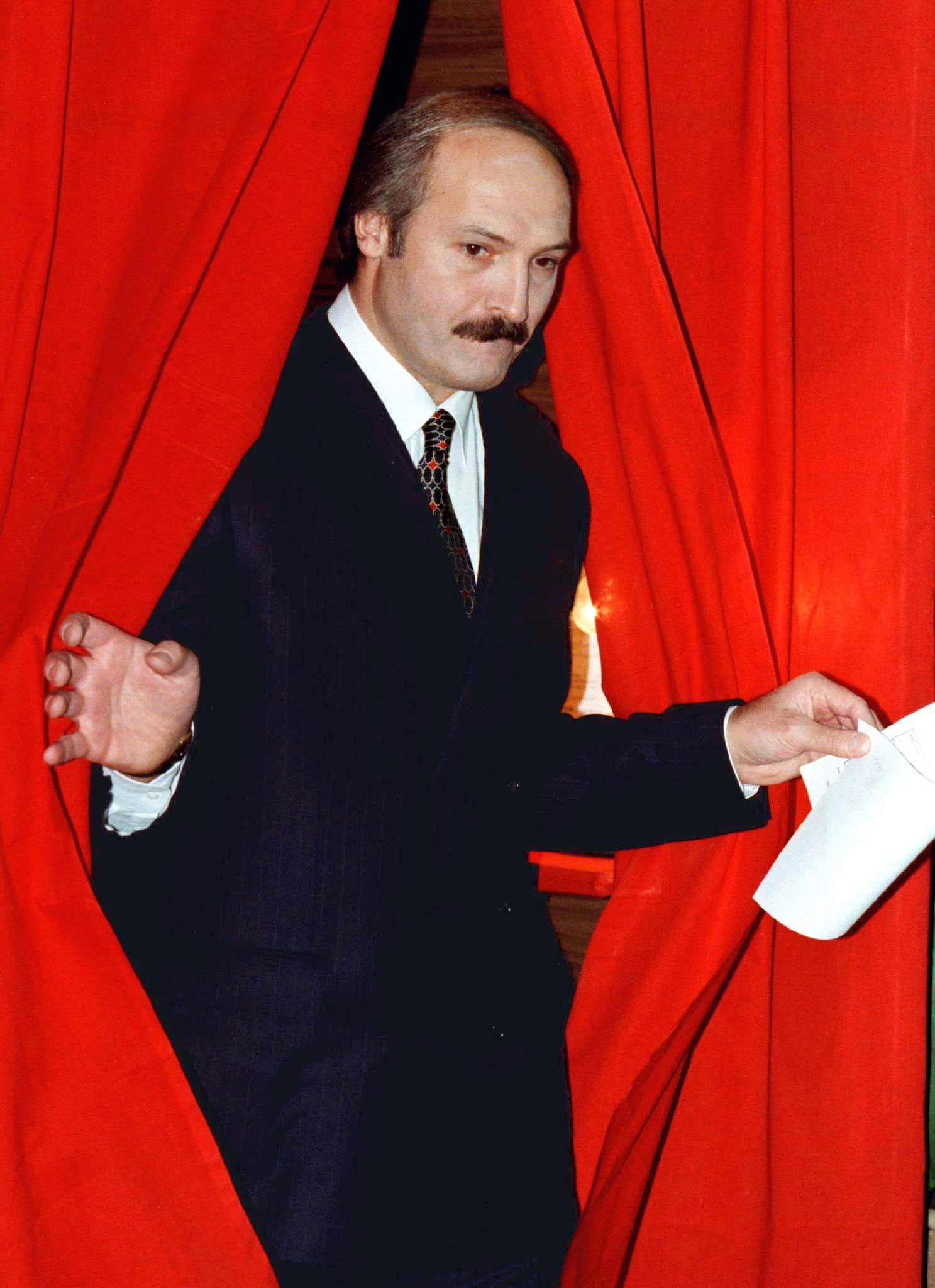 Президент Беларуси Александр Лукашенко выходит из кабины, заполнив бюллетени для голосования на референдуме в Минске 24 ноября 1996 года. Фото: Reuters