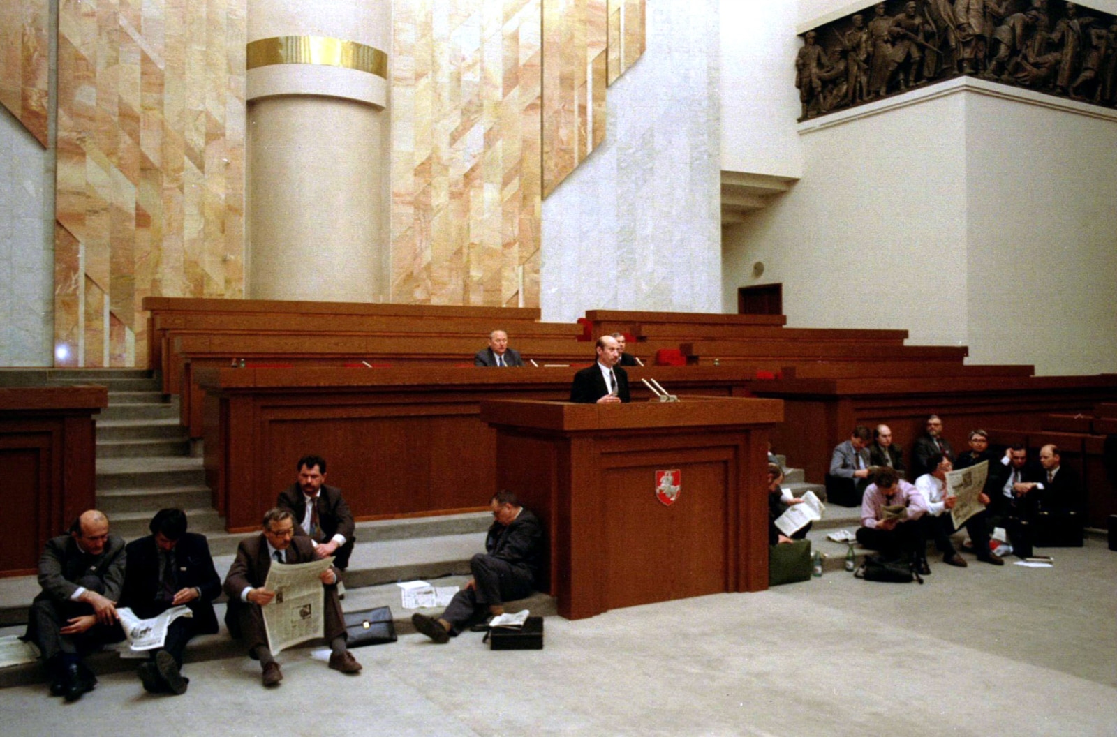 Группа белорусских парламентариев сидит на полу в зале заседаний Верховного Совета в Минске 11 апреля 1995 года. Фото: Reuters