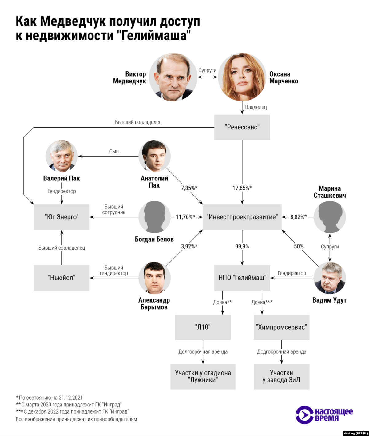 Изначально силы были примерно равны, но Удут смог найти влиятельную "крышу", считает его оппонент из "Магмы": "По нашей информации, он обратился туда, где ему все организовали – завершили дело с нами и реализовали его актив. Удут стал очень богатым человеком. И наверняка поделился". Покровителями Удута стали люди из окружения Медведчука, следует из слов собеседника "Системы". Связь Медведчука с "Гелиймашем" можно проследить с лета 2017 года. Тогда членом совета директоров предприятия стал сын бывшего главы Роснедр Валерия Пака, который незадолго до этого возглавил нефтяной бизнес Медведчука. А в 2018 году в совет директоров "Гелиймаша" вошел поставщик номиналов Медведчука Александр Барымов. Через два года Барымов вместе с женой Медведчука стали совладельцами "Гелиймаша". Тогда же, в 2020 году, предприятие продало свою "самую сладкую" площадку – пять гектаров на Лужнецкой набережной. А в 2022 году "Гелиймаш" расстался с еще одним столичным активом – четырьмя гектарами рядом с бывшим заводом ЗИЛ.