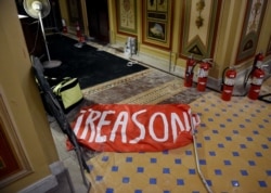 Также за несколько часов до штурма бывшая военная заявила в соцсетях, что вице-президент Майк Пенс, председатель Верховного суда США Джон Роберт должны подать в отставку по причине "государственной измены" и за то же следует предъявить обвинения бывшему генпрокурору США Роду Розенстайну. Плакаты с надписью "Treason" (государственная измена) сторонники Трампа принесли с собой в Конгресс: