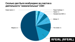 Всего "Медуза" фигурирует в 22 делах, из которых семь заведены на журналистов, сотрудничающих с изданием. За публикацию ссылок и комментарии другим "нежелательным" СМИ было составлено 19 протоколов: "Важные истории", The Insider , "Дождь", "Проект", "Новая газета" и Радио Свобода, а также два неназванных медиа.