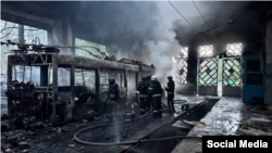 По его данным, один троллейбус после удара выгорел полностью, еще 18 получили повреждения.