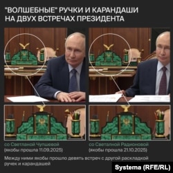 Кроме того, на "консервы" указывает и расположение ручек и карандашей. Например, на второй встрече Путина со Светланой Чупшевой в сентябре 2025 года письменные принадлежности на столе у президента стоят точно так же, как и на встрече с Радионовой в октябре. Между двумя этими встречами прошло почти полтора месяца и девять других мероприятий в кремлевском кабинете. И каждый раз ручки и карандаши стояли по-разному, кроме этих двух встреч.