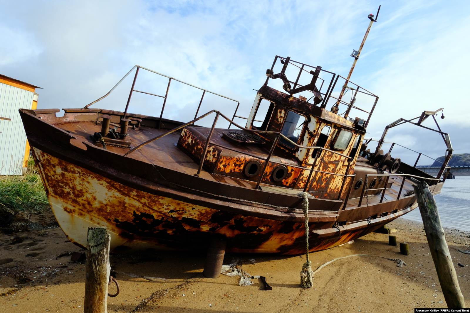 Здесь находится кладбище кораблей, которое можно увидеть в фильме. Скелет кита с афиши был бутафорским, но здесь есть и настоящие морские млекопитающие. Один из китов, 12 метров длиной, недавно выбросился на берег неподалеку, и теперь медведи приходят его доедать. Позвонок еще одного кита висит над дверью рыбацкого домика на сваях прямо над заливом. Но хозяин — по словам местных, его зовут Виктор — наотрез отказывается фотографироваться и вообще общаться с журналистами.