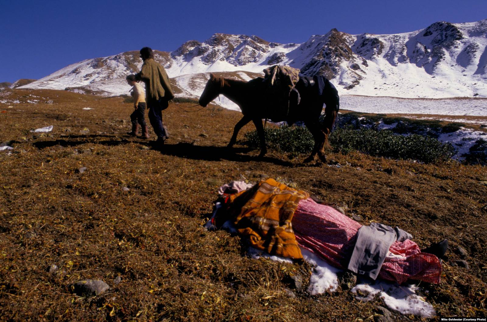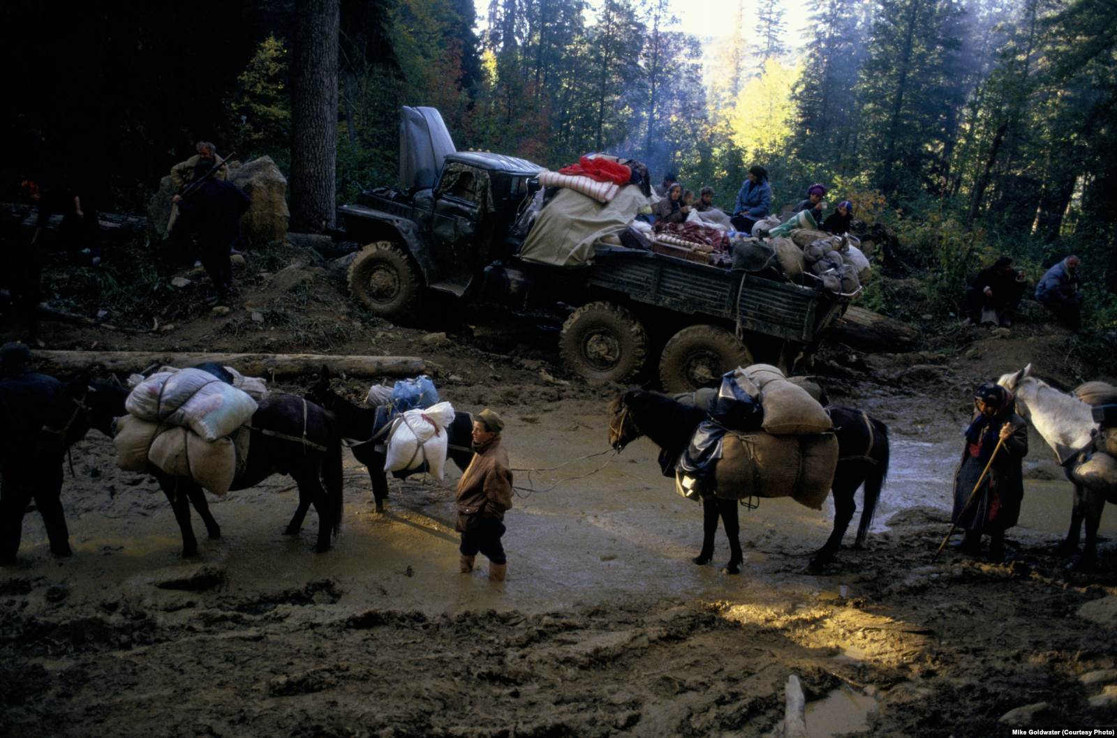 Беженцы из Абхазии начинают переход в Сванетию у подножия первала Чубери, октябрь 1993 года. Фото: Майк Голдуотер (Mike Goldwater)