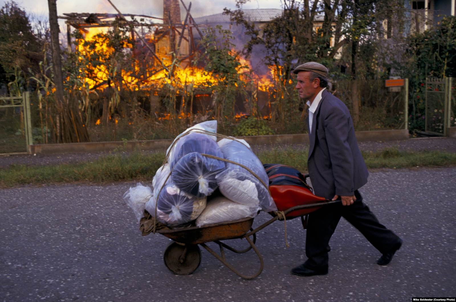 Один из жителей покидает Очамчиры на следующий день после захвата Сухуми, 28 сентября 1993 года. Фото: Майк Голдуотер (Mike Goldwater)