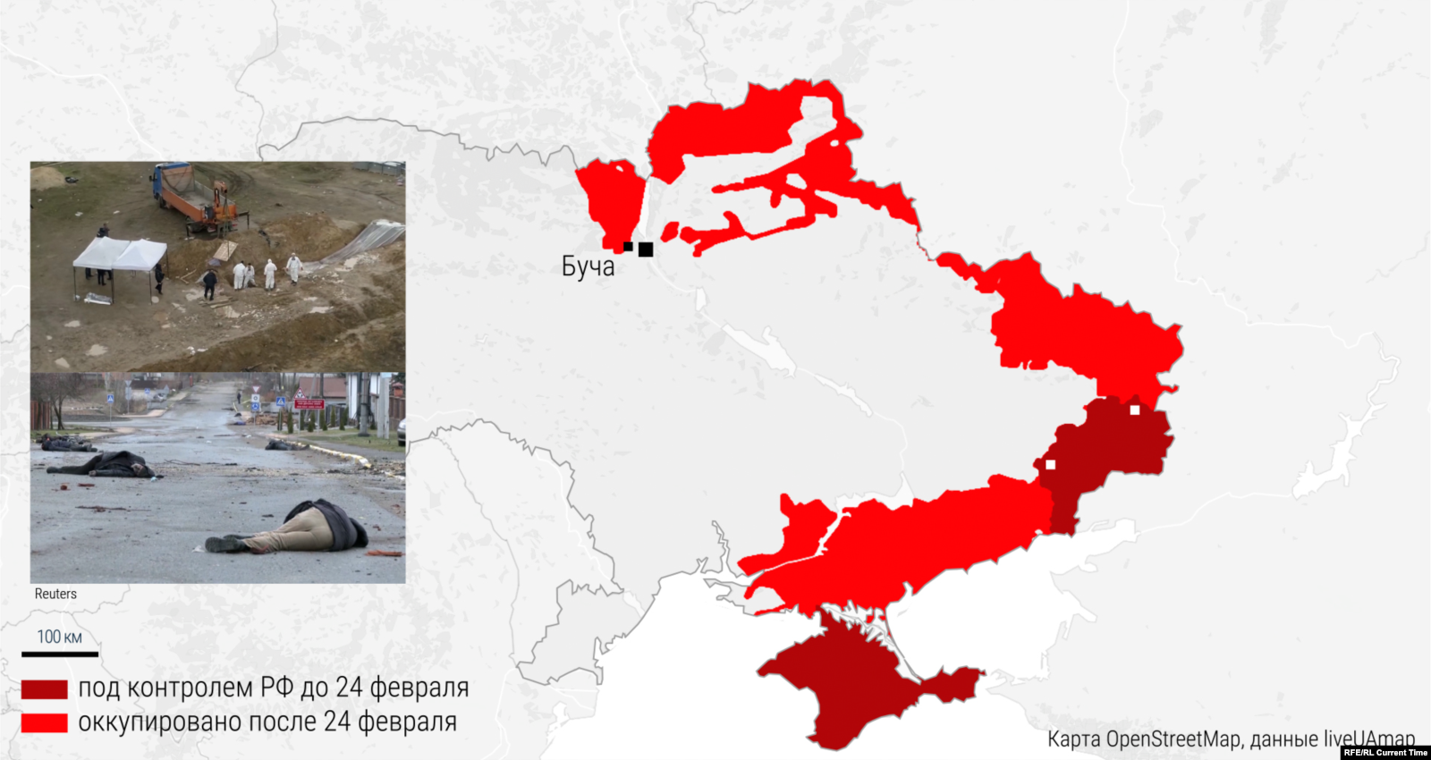 Первые свидетельства массовых убийств мирных жителей в Киевской области начали публиковать днем 1 апреля – на следующий день после отхода российских войск. Журналисты вошли в освобожденные города вместе с украинскими военными, тогда же появились фотографии тел убитых, которые лежали на улицах. Многих находили со связанными за спиной руками и следами пыток. Впоследствии в городе Буча были найдены братские могилы, в которых лежали десятки убитых. Кроме того, стало известно, что российская оккупация сопровождалась мародерством, грабежом, похищениями и массовыми расстрелами. Всего в Бучанском районе Киевской области, по данным МВД Украины, были убиты 1137 человек, из них 461 были убиты в самой Буче. Украина обвинила Россию в военных преступлениях и преступлениях против человечности. Россия заявила, что армия к гибели мирного населения непричастна, а многочисленные доказательства убийств были сфабрикованы, однако авторы многочисленных независимых публикаций после анализа свидетельств из Бучи пришли к выводу, что обвинения в постановке не имеют под собой оснований