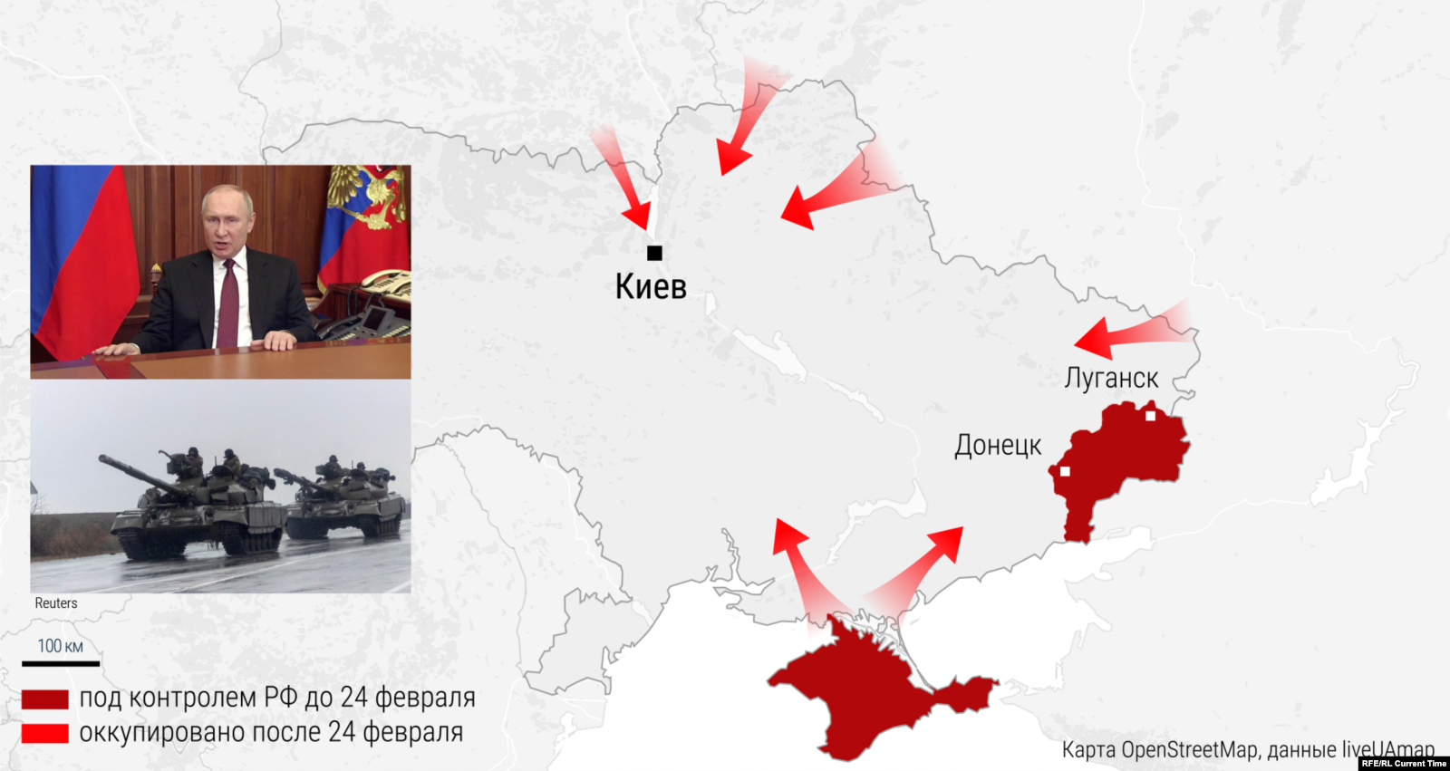 В ночь на 24 февраля Владимир Путин выступил с обращением о начале "специальной военной операции" в Украине. Около 5 утра по киевскому времени российские войска вторглись на территорию Украины с трех направлений: из РФ, оккупированного Крыма и Беларуси. Наступление также началось с территорий неподконтрольных Украине "ДНР" и "ЛНР". Точечным ударам подверглись военные и инфраструктурные объекты по всей Украине, почти во всех крупных городах были слышны взрывы. В первый день вторжения начались бои за аэродром в Гостомеле в семи километрах от Киева, куда высадился российский десант (высадка в итоге окончилась неудачей), российские военные захватили Чернобыльскую АЭС и подошли вплотную к украинской столице; сообщалось о появлении диверсионных групп в киевском районе Оболонь.