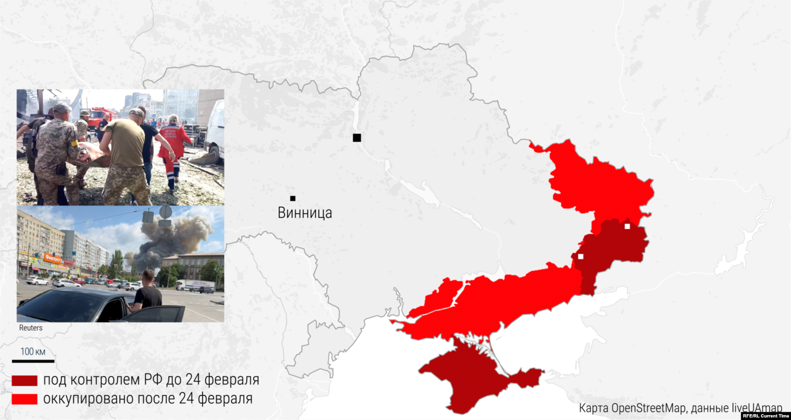 Ракетный удар по центру украинского города Винница в 400 километрах от зоны боев российская армия нанесла около 11 утра. На месте погибли 23 человека, еще пятеро позже скончались в больнице. Пострадавших – более сотни, у многих из них серьезные ожоги. Обстрел частично разрушил Дом офицеров, офисное здание, частную клинику, повредил жилые дома и уничтожил машины на парковке (во многих были люди).