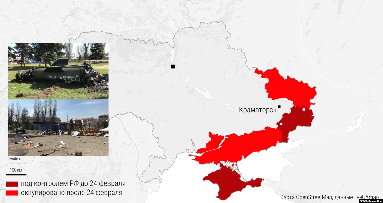 Ракетный удар по железнодорожному вокзалу в Краматорске был нанесен около 10:30 утра по местному времени. В это время на вокзале находилось большое количество гражданских – люди ждали эвакуации в преддверии предполагаемого масштабного наступления российских войск на востоке Украины. В результате погибли 60 человек, не менее 100 получили ранения, по числу жертв этот удар остается самым крупным с начала вторжения. Журналистские расследования установили, что для удара была применена ракета "Точка-У", снаряженная кассетной боеголовкой, что способствовало высокой поражающей силе. Россия и Украина обвинили в обстреле друг друга. В Москве заявляли, что ракеты "Точка-У" есть на вооружении только в Украине, однако независимые исследователи установили, что эти ракеты используются и ВС России, а также есть у сепаратистских формирований, например в “ДНР”. Американский Институт изучения войны и ряд других западных организаций называли аргументы России несостоятельными.