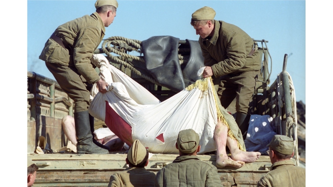 Тела погибших сначала укладывали возле развалин домов, а потом отвозили в холодильник, который находился рядом с профессионально-техническим училищем №6.